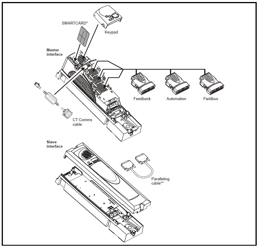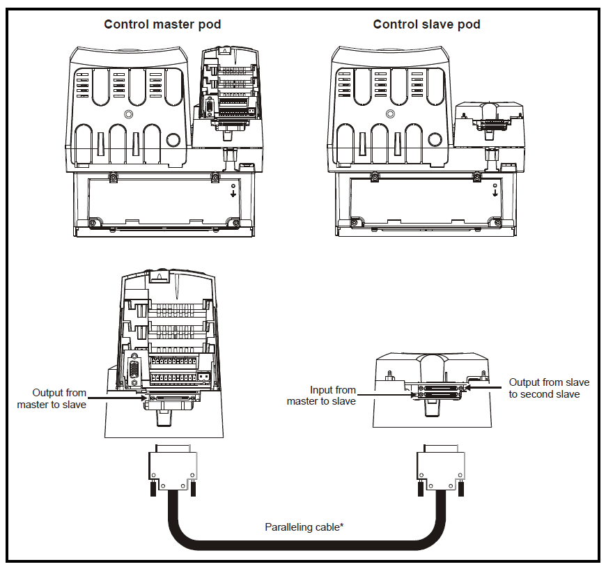 SPMD 또는 SPMA 파워 모듈에 SM-Control Master와 SM-Control Slave를 장착한 후 페어링 케이블을 위의 그림과 같이 장착합니다.